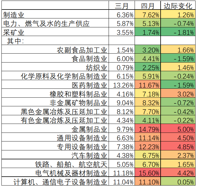 4月份,规模以上工业增加值同比实际增长9.8%(前值14.1%),两年平均增长6.8%(前值6.2%),环比增速0.52%(前值0.6%),总体判断工业生产处在复苏进程中,环比增速小幅回落。分行业看,规模以上工业企业中制造业生产维持高增,其中金属制品业、专用设备制造业、通用设备制造业、电气机械及器材制造业、橡胶和塑料制品业、汽车制造业生产加速。1-4月份,全国固定资产投资143804亿元,同比增长19.9%(前值25.6%),两年平均增长3.9%(前值2.9%),4月份季调环比1.49%(前值2.1%)。其中,制造业投资同比增长23.8%(前值29.8%),两年平均-0.4%(前值-2.0%),制造业投资改善趋势明显好于整体投资。