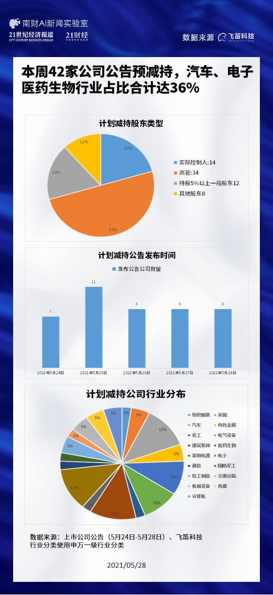 据飞笛科技统计,5月24-5月28日期间,共有42家上市公司披露了计划减持的公告,较上周数量下降9家。涉及计划减持对象68个,其中有12家公司的实控人参与计划减持,占比29.27%,比例较上周有所上升。塞力医疗(603716.SH)的实控人计划减持比例最高,减持最高占比将达到公司总股本的6.00%。