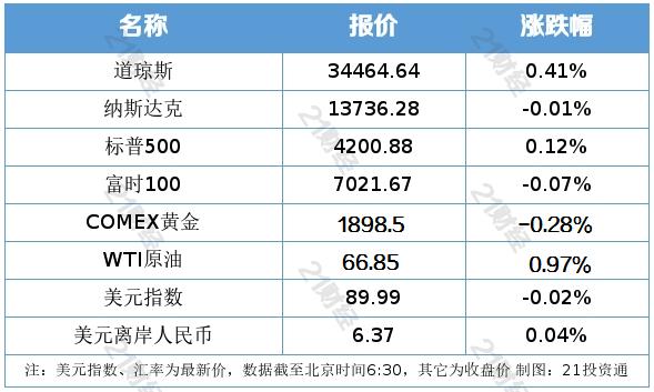 欧美股市涨跌不一,道指涨逾百点,标普500指数逼近历史高位,纳指微幅收跌;部分散户抱团股活跃,AMC院线收涨近36%,今年以来累涨超1150%。国际金价小幅下跌,国际油价收涨。