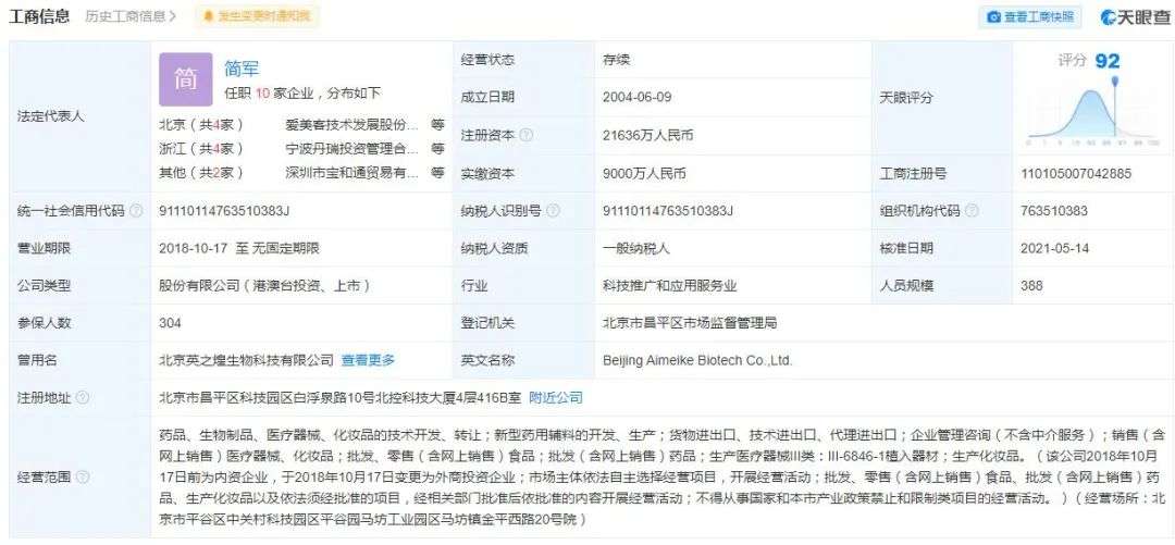 天眼查显示,爱美客成立于2004年,是一家主打玻尿酸产品的公司,目前已有5款获国家药监局批准的III类注射用透明质酸钠系列产品。
