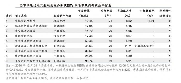 华泰证券研究员程晨认为,从审批通过的九只基础设施公募REITs 派息率来看,垃圾处理、收费公路等特许经营项目派息率较高,相关产品募集说明书披露的当期净现金流分派率平均值为8.70%,仓储物流、产业园区等非特许经营项目派息率较低,当期派息率平均值为4.36%。