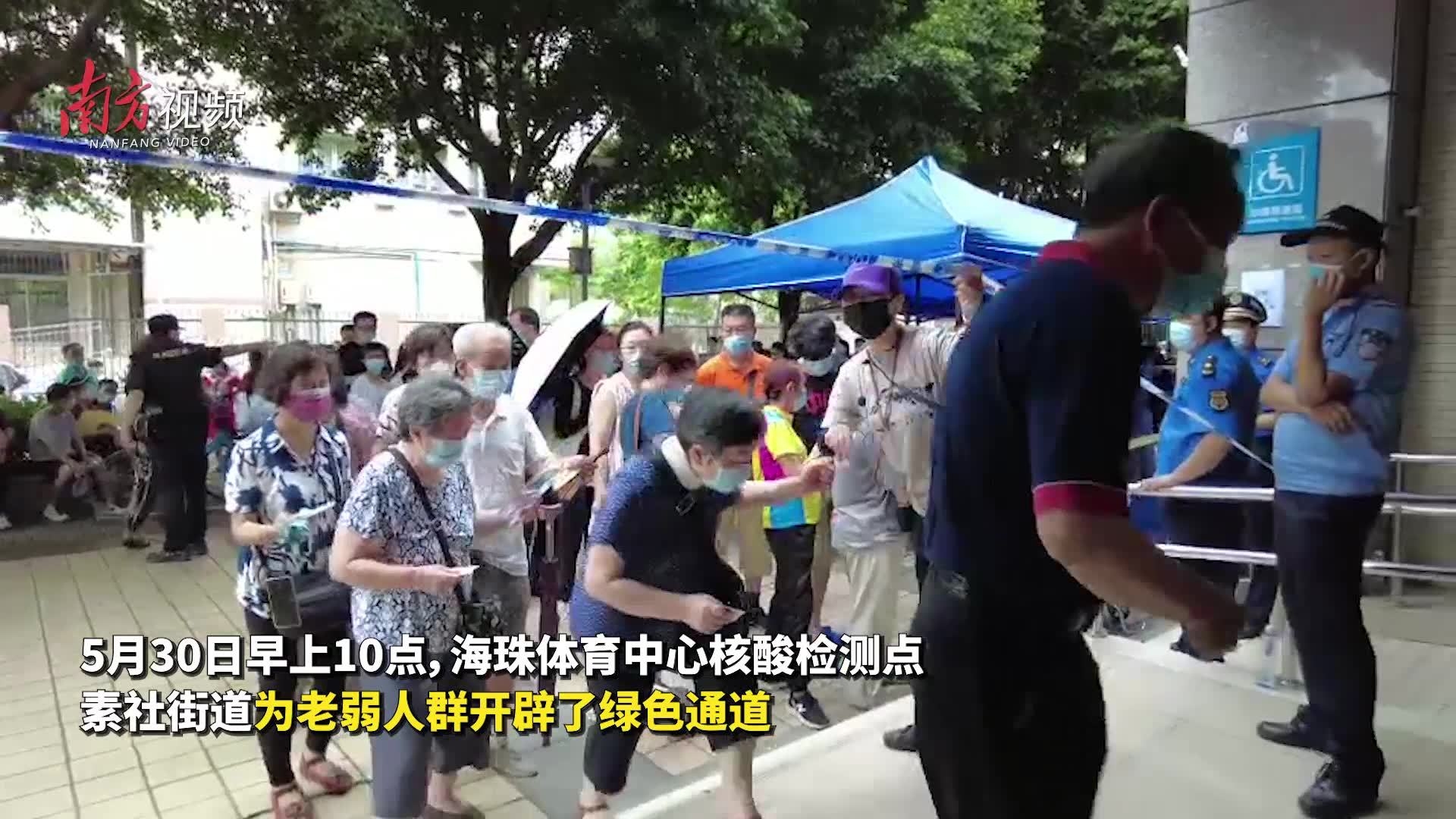 早上10点,广州的气温逐渐升高,在海珠体育中心的核酸检测点,素社街道为老弱人群开辟了绿色通道,工作人员和党员志愿者们全程帮助老人和行动不便者检测核酸,大大缩短了等候的时间。刘婆婆告诉记者:“今天是家人陪我过来,到了之后又有志愿者帮忙,过程都很顺畅。”