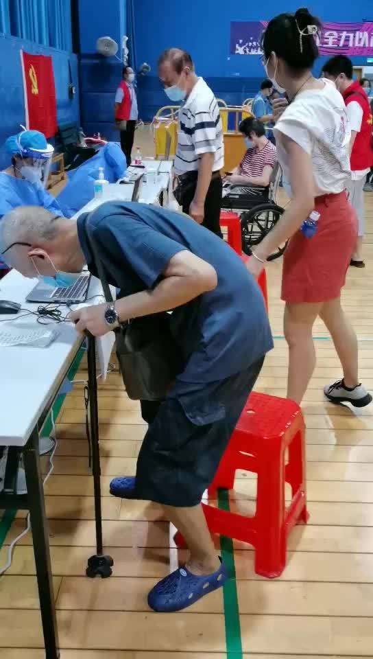 今天上午,广州气温偏高。东堤幼儿园的李姓小朋友因为从床上跳起来骨折,奶奶先带着他来排队登记。现场志愿者看到后,马上抱着小朋友排队,填写资料。“感谢,感谢。”奶奶虽然普通话不好,竖起大拇指不停点赞。爸爸随后赶到,对志愿者表示感谢。