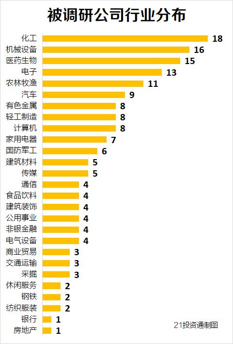 从行业分布来看,化工最受机构青睐,有18家获调研,包括齐翔腾达(002408.SZ)、华邦健康(002004.SZ)、*ST盐湖(000792.SZ)、藏格控股(000408.SZ)、海利得(002206.SZ)、贵州轮胎(000589.SZ)等,其次是机械设备、医药生物均有15家以上公司获调研。