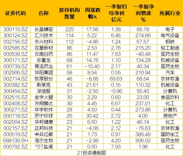 接待机构数量方面,长盈精密(300115.SZ)成为最受机构青睐的个股,获225家机构扎堆调研。此外,汇川技术(300124.SZ)、永兴材料(002756.SZ)也获超100家机构调研。