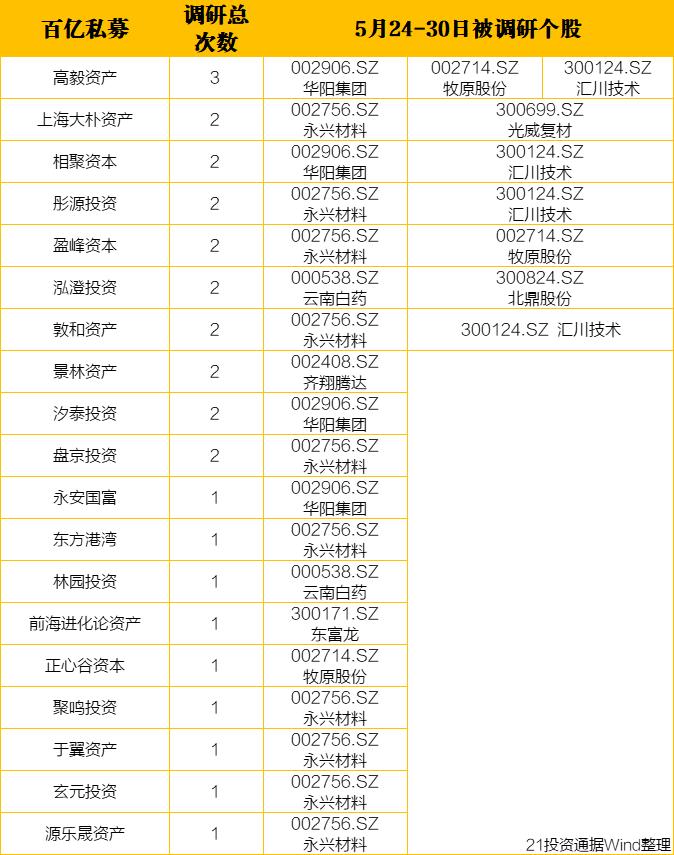 从具体调研机构来看,景林资产、高毅资产等19家百亿级私募调研了9家公司。其中永兴材料最受百亿私募关注,有包括盈峰资本、敦和资产、盘京投资、东方港湾等10家私募调研。