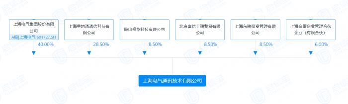 启信宝数据显示,通讯公司成立于2015年3月16日,注册资本为3亿元,股权结构比例分别是上海电气持股40%、上海星地通通信科技有限公司持股28.50%、鞍山盛华科技有限公司持股8.50%、北京富信丰源贸易有限公司持股8.50%、上海东骏投资管理有限公司持股8.50%、上海奈攀企业管理合伙企业(有限合伙)持股6.00%。