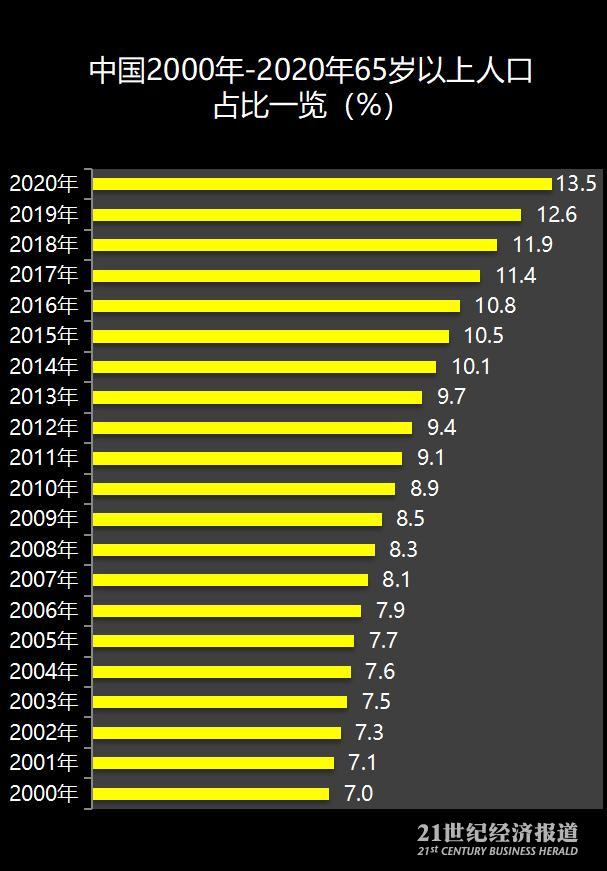 从65岁老年人口占比也可以看出,中国老龄化程度在加快。人口普查和中国统计年鉴的数据显示,2000年,中国65岁以上人口占总人口的比例仅有7%,这一数字在2014年突破10%大关,达到10.1%。而2020年,我国65岁及以上人口为19064万人,占总人口的比重达到13.50%。
