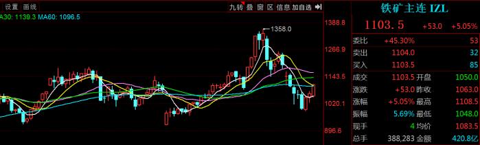 5月31日,黑色系期货表现强势,铁矿石期货主力合约涨幅超过5%,铁矿石主力合约已经连涨三天,涨幅超过10%。目前铁矿石期货主力合约的价格为1095.5元/吨。铁矿石指数也站稳1000点,最新报1105元/吨。