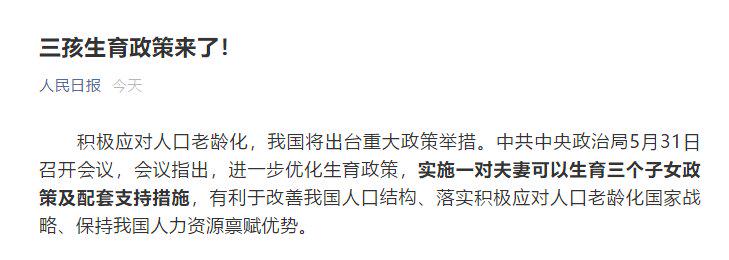 5月31日下午,高层会议宣布依法组织实施三孩生育政策,促进生育政策和相关经济社会政策配套衔接。