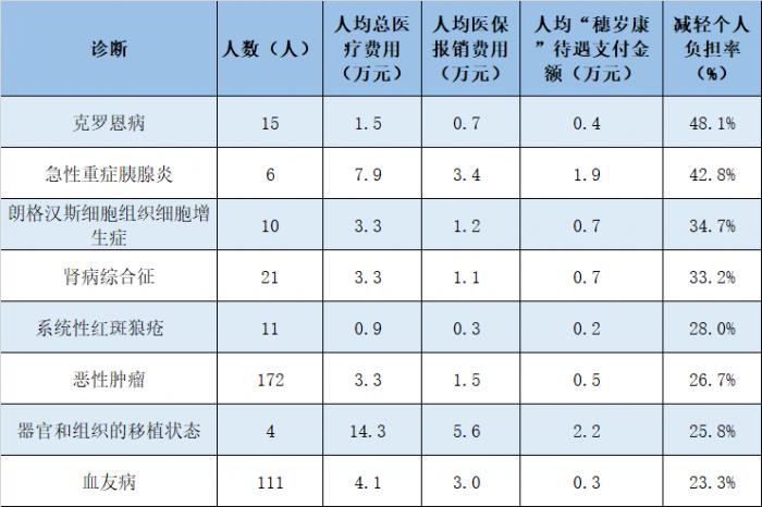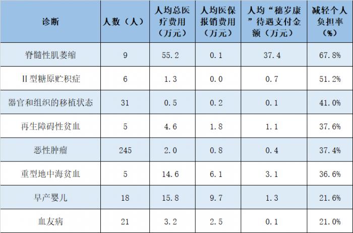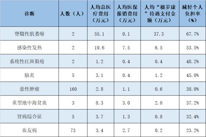 该年龄段报销比例前八名的疾病费用及待遇支付情况如下表: