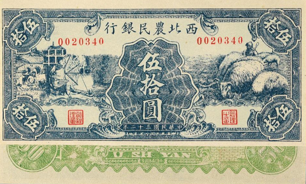 1937年9月抗日战争爆发后,八路军第一二零师进入晋西北地区,创立了晋西北抗日根据地,在陕西兴县建立了兴县农民银行。1940年5月10日,晋西北行署以该行为基础,成立西北农民银行并发行“西农币”,此货币从抗日战争时期一直沿用至解放战争结束,历时近9年,为支援抗战、保障供给、巩固根据地起了重要作用。