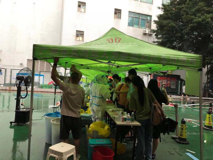骄阳似火,又遇雷雨骤至,在克服重重困难下,广州市各区大规模人员核酸检测有序进行。