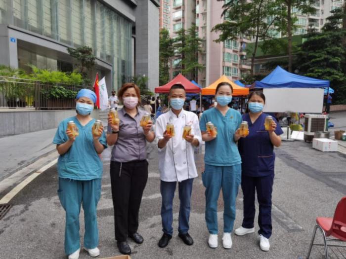 此外,不少爱心企业在组织员工集体前往采样的同时,也为采样队员送上清凉掏出了“看家本领”,熬煮清凉消暑的凉茶,送来了风扇,甚至还把店铺里的风冷和冰块也搬到现场。