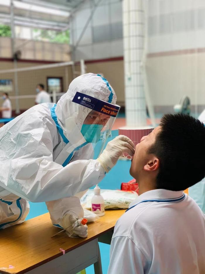 其中100名队员继续在越秀区黄花岗街7个社区开展支援工作,30名队员在荔湾区7所学校,为近8000名高三学生进行核酸检测标本采集。