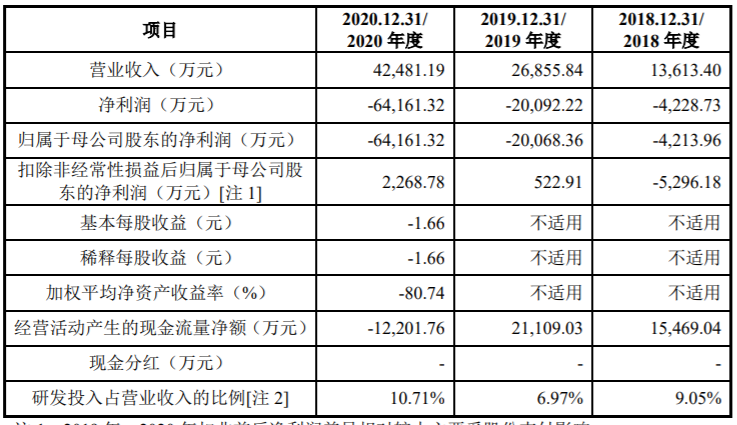 财务数据显示,公司2018年、2019年、2020年营收分别为1.36亿元、2.69亿元、4.25亿元;同期对应的净利润分别为-4228.73万元、-2.01亿元、-6.42亿元,三年合计亏损8.85亿元,三年研发投入占比分别为9.05%、6.97%、10.71%。