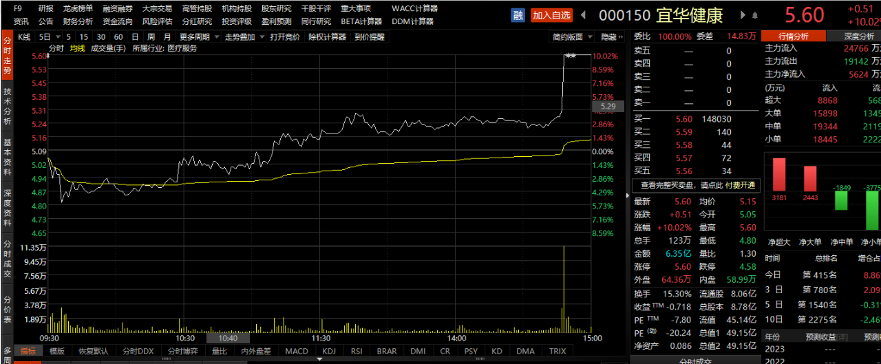 其中,养老概念股宜华健康尾盘涨停,收报5.6元/股。