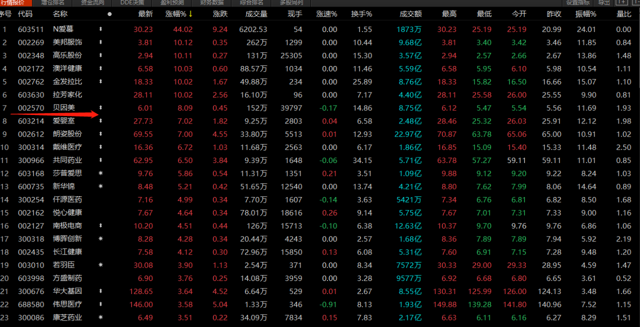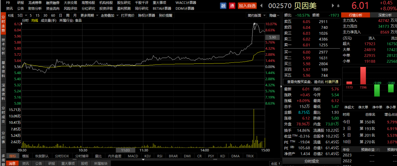 贝因美尾盘也大涨,最后收涨8.09%,报6.01元/股。
