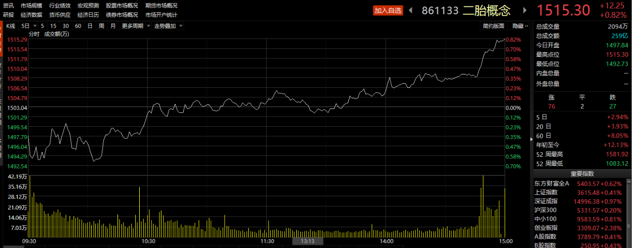 A股二胎概念今日低开,盘中高走,尾盘明显“飙涨”,最后收涨0.82%,76只相关概念股收涨。