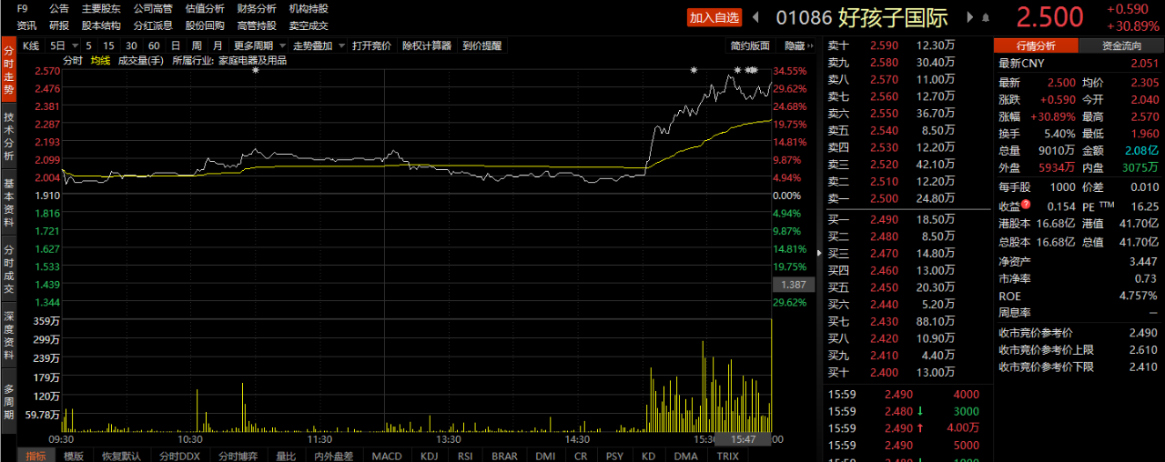 港股好孩子尾盘大涨,最后收涨30.89%,报2.5港元/股。
