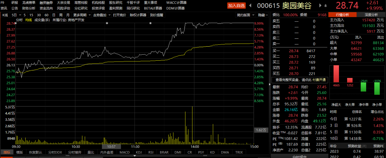 此外,奥园美谷尾盘涨停,收报28.74元/股。