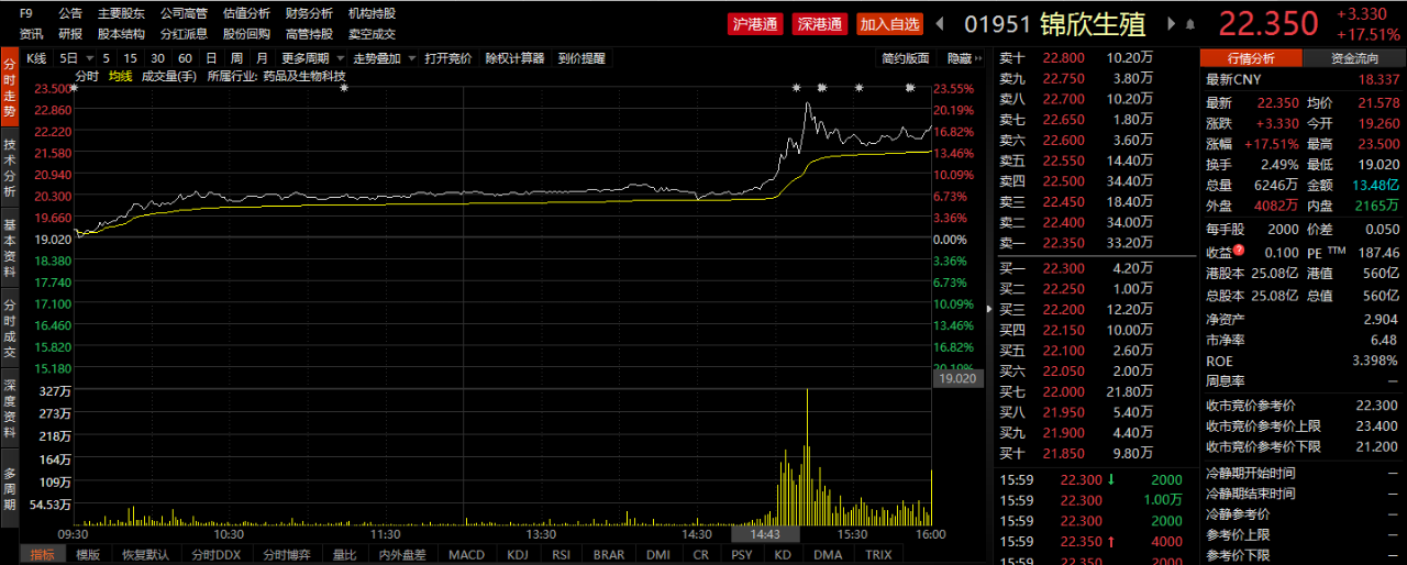 锦欣生殖最终大涨17.51%,收报22.35港元/股。