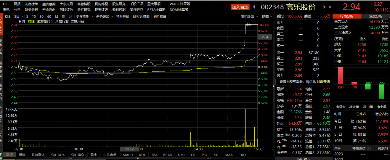 高乐股份尾盘直线涨停,收报2.94元/股。