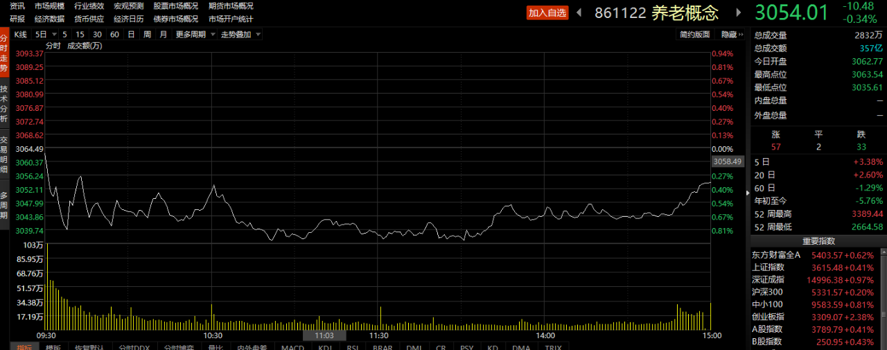 今日养老概念指数开盘下挫,盘中低位震荡,受利好消息刺激,尾盘拉升明显,最终跌幅收窄至0.34%,57只相关概念股上涨。业内人士告诉《国际金融报》记者,在人口老龄化趋势下,娱乐服务、生活消费等“银发经济”值得关注。