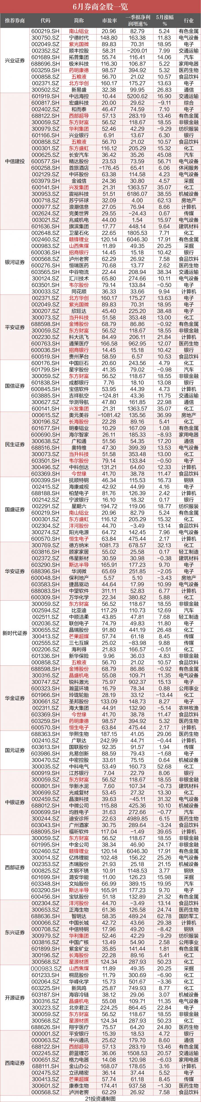 据21投资通(微信号ID:touzit21)不完全统计,截至5月31日,已有兴业证券、中信建投、银河证券、国信证券、华安证券、华金证券、西南证券等16家券商公布了6月投资组合,其推荐了A股134只“金股”。