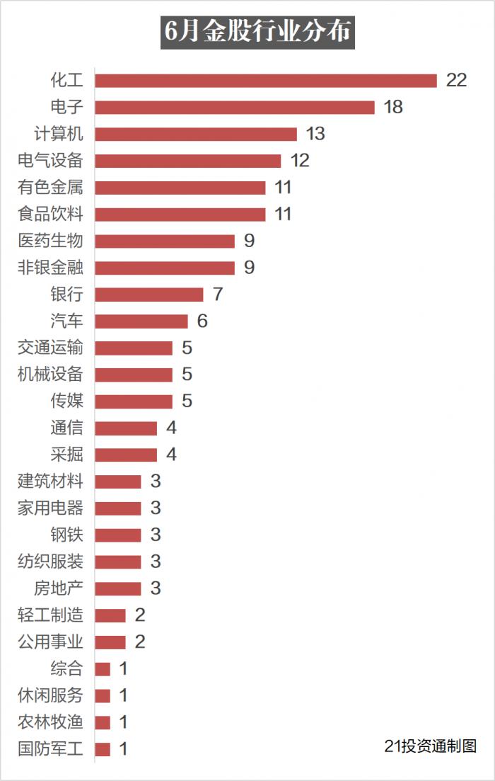而从“金股”行业分布看,被推荐个股多集中在化工(22只)、电子(18只)、计算机(13只)、电气设备(12只)、有色金属(11只)、食品饮料(11只)等板块。