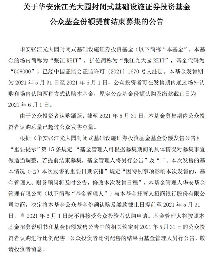 首批9只公募REITs的火爆可以说是现象级的。5月31日,首批9只公募REITs向公众投资人公开发行,结果无一例外全部发公告称,由于公众投资者认购踊跃,截至2021年5月31日,基金募集期内公众投资者认购总量已超过公众发售总量。