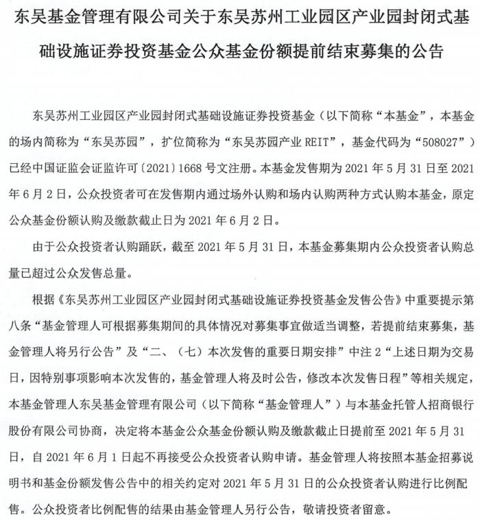 也就是说,因为投资者的“疯抢”,首批9只公募REITs发行当天全部“卖爆”,基金管理人纷纷发公告要提前结束募集,对公众投资者认购进行比例配售。21世纪经济报道记者从渠道获悉,9只公募REITs的配售比例均在5%以下。