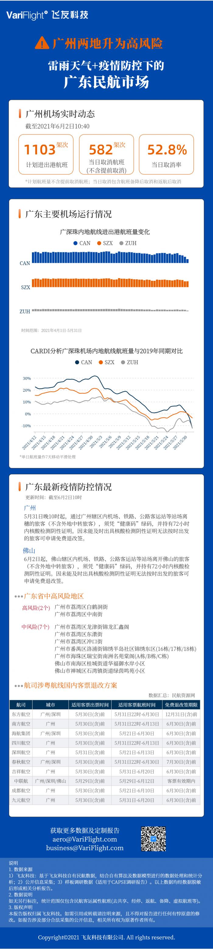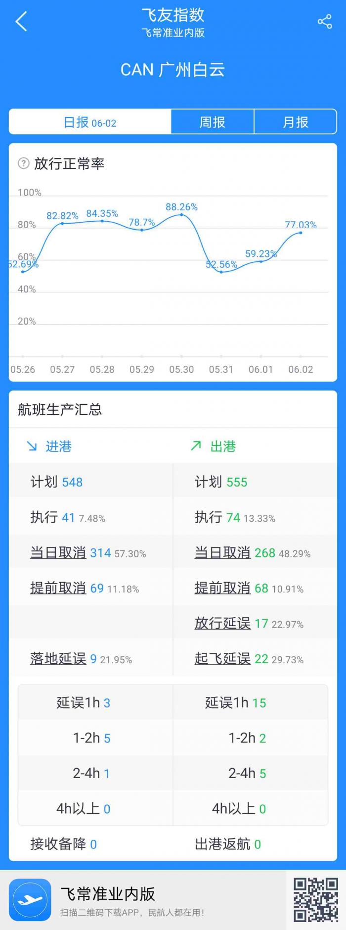 6月2日,广州区域部分航路航段预计7:00-12:00受雷雨天气影响,通行能力下降20%左右。飞常准业内版统计显示,截至6月2日10:40,广州白云机场计划进出港航班1103架次,当日取消航班582架次,当日取消率已达52.8%(计划航班量不含提前取消航班;当日取消包含航班备降后取消和返航后取消)。
