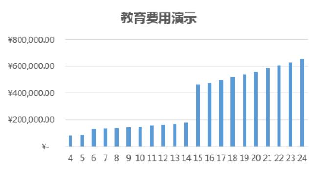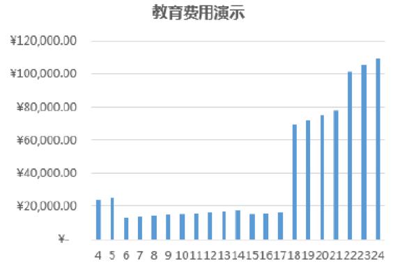 如果列成柱状图,可以看出此案例的主要支出发生在孩子大学之后,我们规划的方法就是从孩子6岁现在开始的到17岁的教育费用在日常家庭支出里解决,在18岁之前,我们要给孩子攒够高峰期大学本科加研究生的61万费用。
