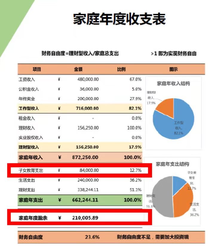 在表里可以看到,孩子现在6岁,准备上小学。家里每月的幼儿园学费支出是7000元,收支轧差算下来,每年家里可以盈余21万元。那这21万元就可以拿来做教育金或者养老金的规划。