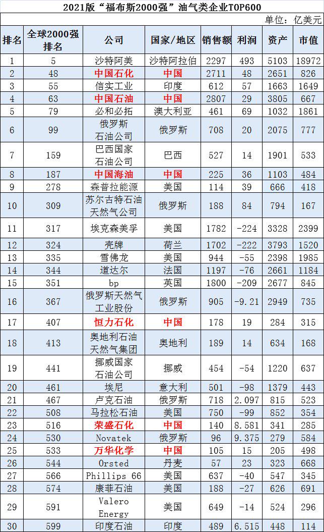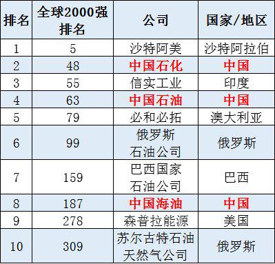 从全球2000强排名来看,位居油气业第一的是沙特阿美,和上年一样保持在全球第5的位置。中国石化和中国石油均入围百强,全球排名分别是第48位、63位。
