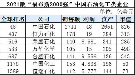 石油化工类企业,除中国石化外,还有恒力石化、荣盛石化、万华化学、台塑石化、中国化工、恒逸石化入围全球2000强。其中恒力石化利润最高,为19亿美元,其次是万华化学。