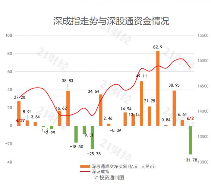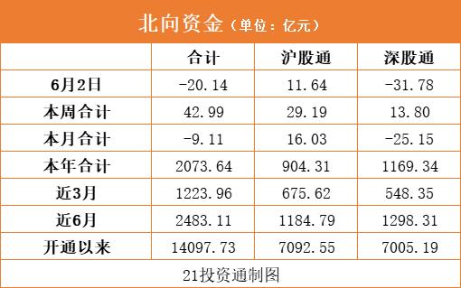 据21投资通(微信号ID:touzit21)智能监测,北向资金今日先抑后扬,开盘后基本是单边净流出,午后一度净流出超过50亿元,但在尾盘一个小时左右回流了30亿元,全天流出净额收窄至20.14亿元。具体来看,沪股通净流入11.64亿元,深股通净流出31.78亿元,沪、深股通出现了比较明显的分化。