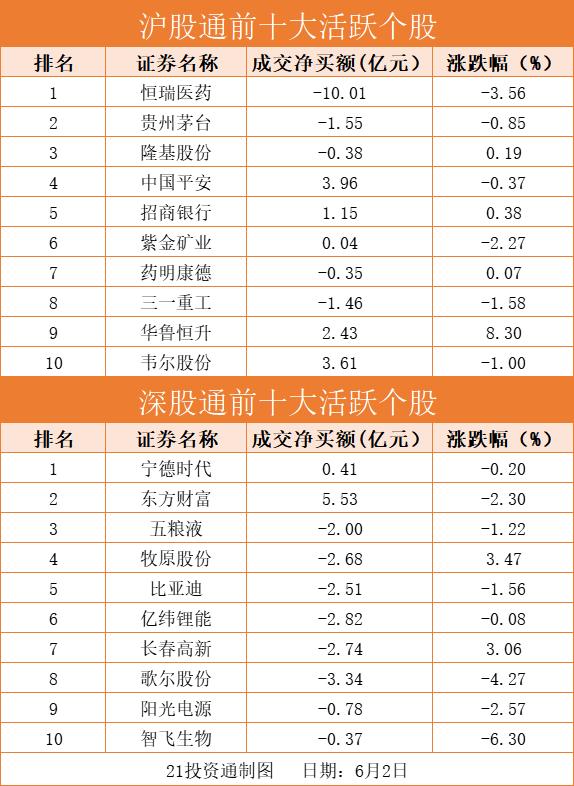 北向资金十大活跃个股方面,恒瑞医药、歌尔股份、亿纬锂能分别遭净卖出10.01亿元、3.34亿元、2.82亿元;东方财富逆市获净买入5.53亿元。
