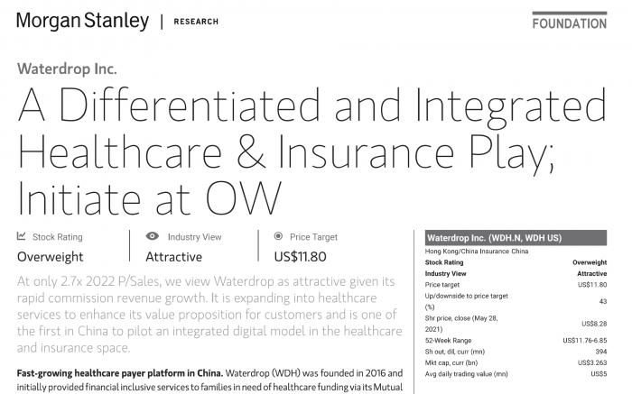 摩根士丹利近日发布研报,给予水滴公司(WDH.US)“增持”评级,目标价11.80美元。研报分析指出,鉴于水滴公司快速增长的佣金收入和医疗服务领域的布局成为此次给予“增持”评级的主要考量因素。大摩预计,公司将在2023年实现盈利,净利润率将达到7%。
