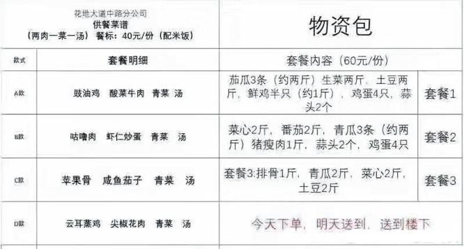 此外,住户亦可选择购买食材物资包。据村委会下发给住户的表格显示,第一档物资包售价115元内含1斤猪肉上肉、1.5斤猪排骨、30个鸡蛋、2斤菜心和2斤西红柿。第二档物资包售价60元,表格粗略地交代了内含鸡蛋、肉和蔬菜。