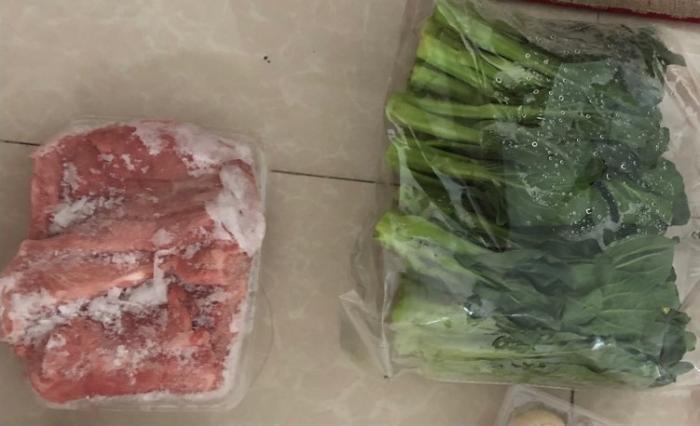 在买到物资包之前,胡罗靠泡面、乌冬面和一些膨化零食应付三餐。直到昨日(6月1日),胡罗终于抢到了60元档次的物资包,里面有3条青瓜、4个鸡蛋、4个西红柿、2头蒜、一盒菜心和一盒猪肉。