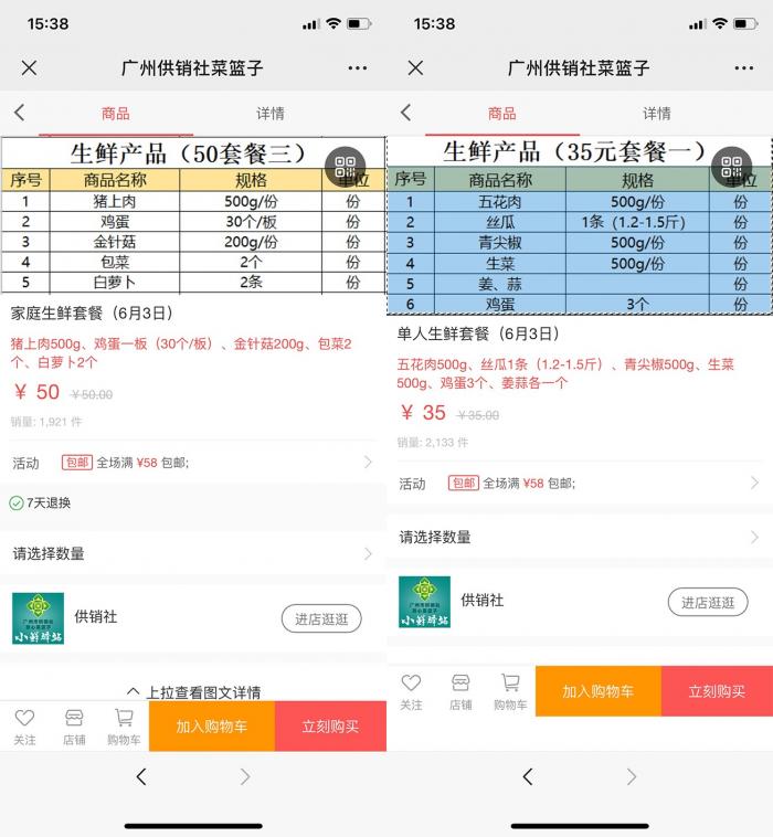 但到了6月2日下午,物资包订购链接上了新套餐。记者登录广州供销社菜篮子小程序看到,小鲜驿站供销社提供了家庭/单人生鲜套餐(6月3日)两种不同选择。