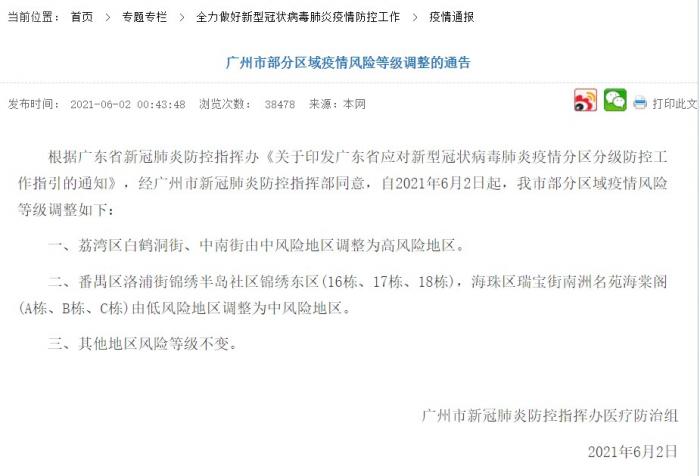 据广州市卫健委官网通报,自6月2日起广州市荔湾区白鹤洞街、中南街由中风险地区调整为高风险地区。根据低中高风险等级划分标准,高风险地区的调整需满足两个条件,一是累计病例超过50例,二是在14天内该区域有聚集性疫情发生。