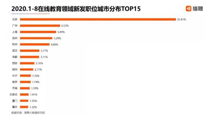 值得注意的是,除北京因教育资源相对集中,在线教育企业密集度远远高于其它城市之外,武汉、成都、长沙等新一线城市在线教育新发职位占比与上海、广州、深圳等老一线城市之间的差距正在缩小。