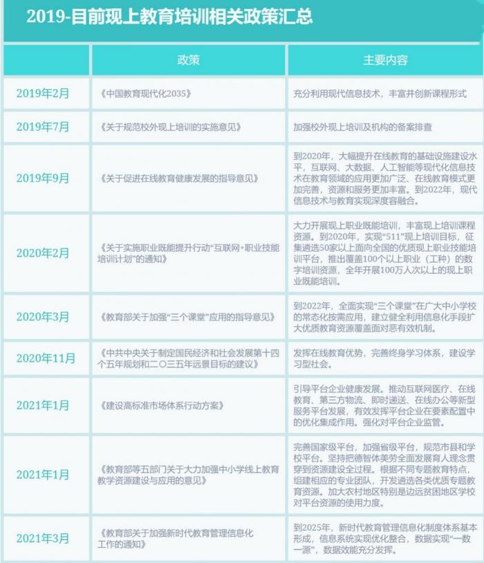 随着行业乱象频出和影响力的扩大,在线教育监管规定也在逐渐明晰。2018年开始,国家针对教培机构规范管理问题多次出台文件,机构迎来史上最严监管政策的推出——过渡期——落实期。
