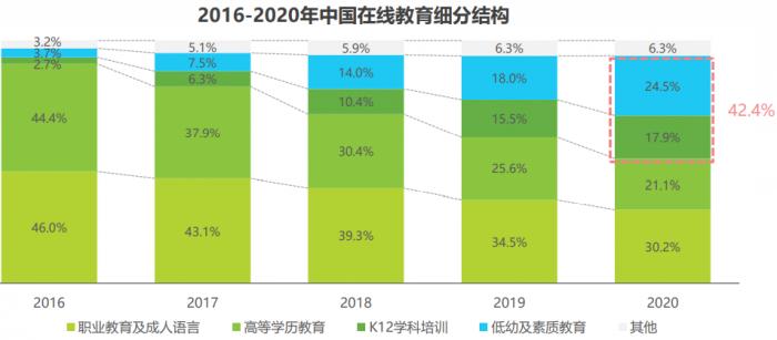 据艾瑞咨询报告显示,从2016到2019年,教育行业线上化率从8%-10%提升5个百分点至13%-15%,平均每年提升约1.7个百分点。其中K12学科培训、低幼及素质教育线上化率由此前的1%提升至5%-8%。近年来,低幼及素质教育、K12学科培训近两年在在线教育领域的市场份额持续扩大,2020年市场份额分别为24.5%和17.9%。