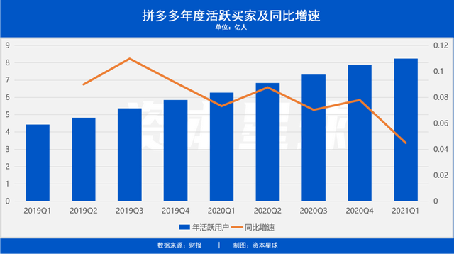 截止今年3月31日,拼多多年度活跃买家达到8.24亿,高于阿里巴巴不久前公布的8.11亿。