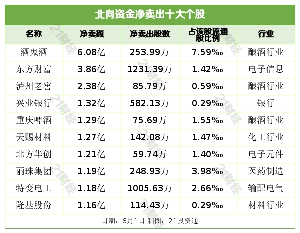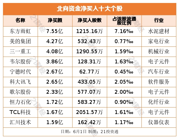 个股方面,北向资金净买入东方雨虹(002271.SZ)、美的集团(000333.SZ)、三一重工(600031.SH)、韦尔股份(603501.SH)、宁德时代(300750.SZ)居前。净卖出酒鬼酒(000799.SZ)、东方财富(300059.SZ)、泸州老窖(000568.SZ)、兴业银行(601166.SH)、重庆啤酒(600132.SH)居前。