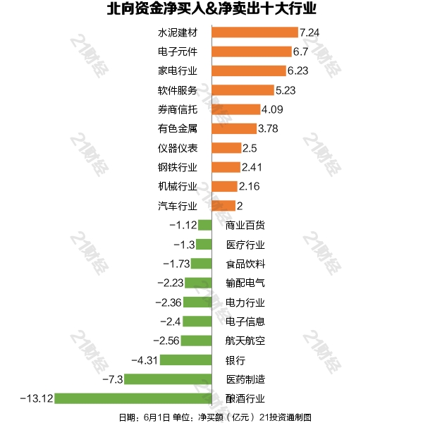 从净买入金额来看,北向资金增持了33个行业,其中水泥建材居首,净买入金额达7.24亿元,其次是电子元件行业,净买入6.70亿元。北向资金减持了26个行业,其中酿酒行业最多,净卖出金额达13.12亿元,其次是医药制造行业,净卖出7.30亿元。